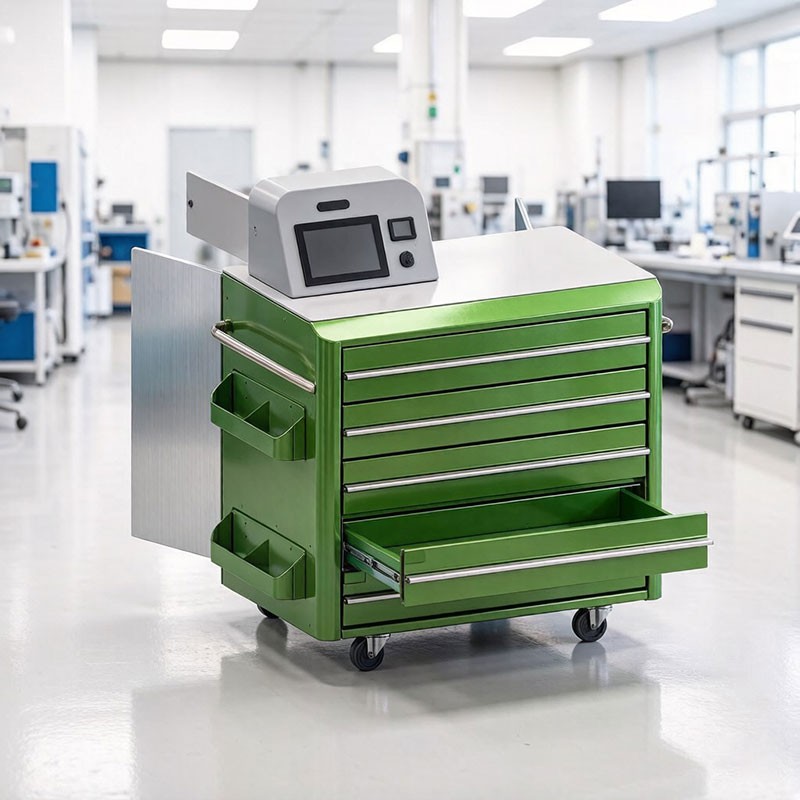 Mobility & Power: Equipped with industrial casters featuring brake locks, powered by an internal battery or connectable to workshop power.