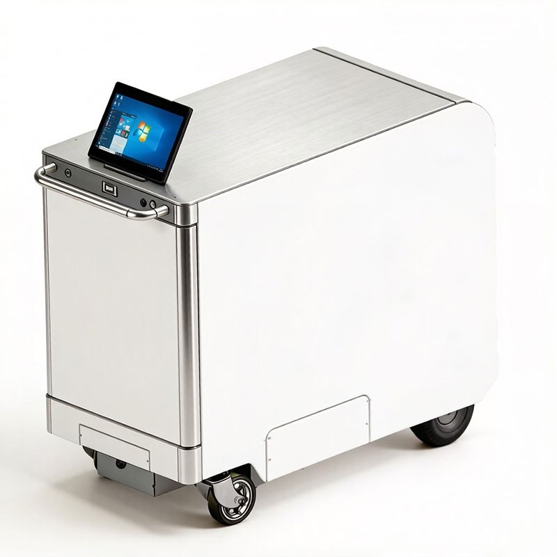This is the Smart RFID Mobile Inventory Cart, an intelligent tool management solution. Operating on the Windows 10 system with a 10.1-inch touchscreen, it features a modern design with a white body and silver accents. Its robust, mobile construction enables efficient, wireless RFID scanning and real-time tracking of tools and equipment directly on the workshop or warehouse floor, streamlining inventory control and asset management